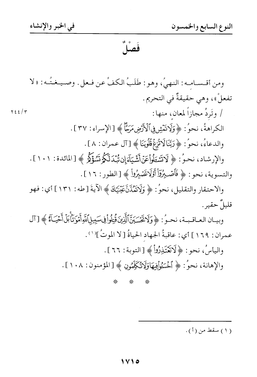 4939 وبيان العاقبة نحو { ولا تحسبن الذين قتلوا في سبيل الله أمواتا بل أحياء } أي عاقبة الجهاد الحياة ( لا الموت )