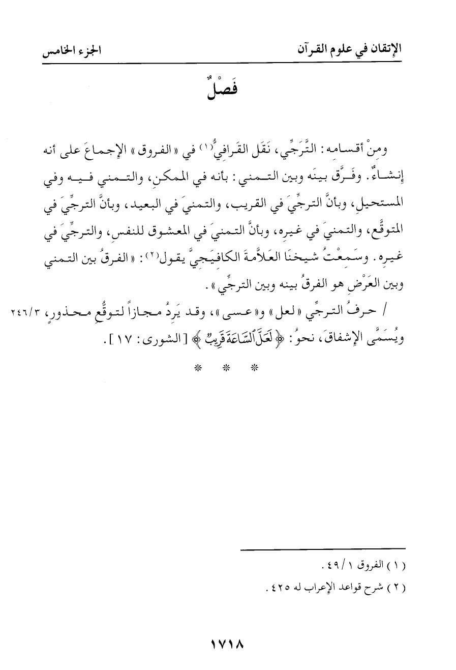 4943 نقل القرافي في ( الفروق ) الإجماع على أنه إنشاء وفرق بينه وبين التمني بأنه في الممكن والتمني فيه وفي المستحيل وبأن الترجي في القريب والتمني في البعيد وبأن الترجي في المتوقع والتمني في غيره وبأن التمني في المشقوق للنفس والترجي في غيره