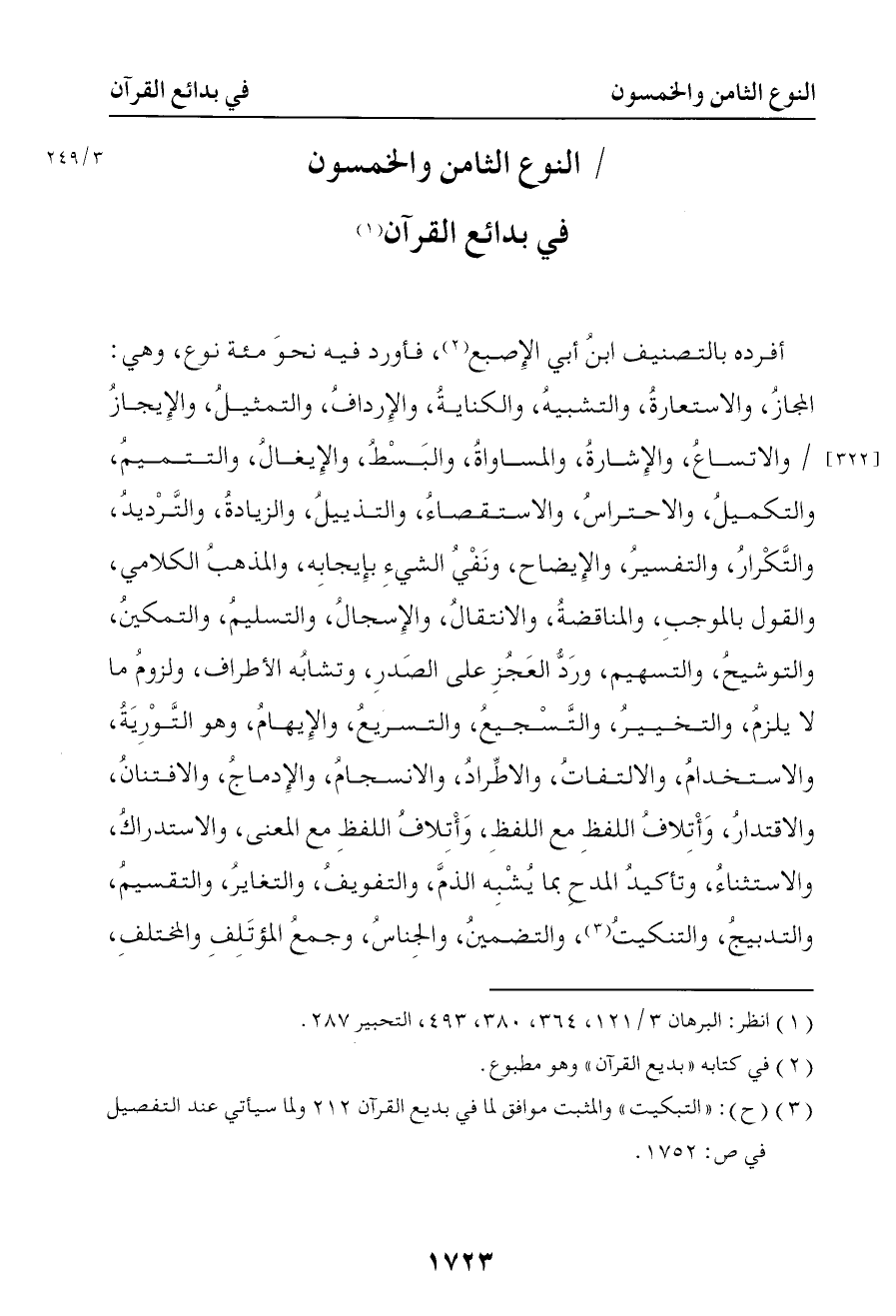 4960 أفرده بالتصنيف ابن أبي الأصبع فأورد فيه نحو مائة نوع وهي المجاز والاستعارة والتشبيه والكناية والإرداف والتمثيل والإيجاز والإتساع والإشارة والمساواة والبسط والإيغال والتتميم والتكميل والاحتراس والاستقصاء والتذييل والزيادة والترديد والتكرار والتفسير والإيضاح ونفي الشيء بإيجابه والمذهب الكلامي والقول بالموجب والمناقضة والأنتقال والأسجال والتسليم والتمكين والتوشيح والتسهيم ورد العجز على الصدر وتشابه الأطراف ولزوم ما لا يلزم والتخيير والتسجيع والتسريع والإيهام وهو التورية والاستخدام والالتفات والاطراد والانسجام والإدماج والافتنان والاقتدار وائتلاف اللفظ مع اللفظ وائتلاف اللفظ مع المعنى والاستدراك والاستثناء والاقتصاص والإبدال وتأكيد المدح بما يشبه الذم والتفويت والتغاير والتقسيم والتدبيج والتنكيت والتجريد والتعديد والترتيب والترقي والتدلي والتضمين والجناس والجمع والتفريق والجمع والتقسيم والجمع مع التفريق والتقسيم وجمع المؤتلف والمختلف