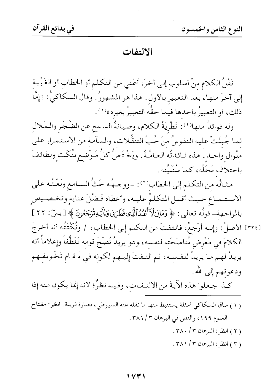 4975 مثاله من التكلم إلى الخطاب ووجهه حث السامع وبعثه على الاستماع حيث أقبل المتكلم عليه وأعطاه فضل عناية تخصيص بالمواجهة قوله تعالى { وما لي لا أعبد الذي فطرني وإليه ترجعون } والأصل ( وإليه أرجع ) فالتفت من التكلم إلى الخطاب ونكتته أنه أخرج الكلام في معرض مناصحته لنفسه وهو يريد نصح قومه تلطفا وإعلاما أنه يريد لهم ما يريد لنفسه