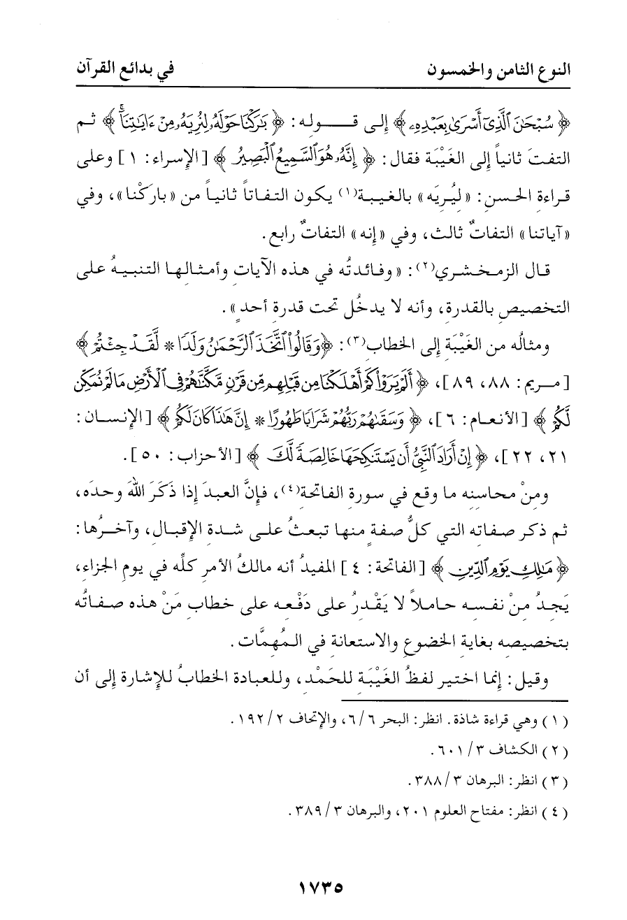 وعلى قراءة الحسن ( ليريه ) بالغيبة يكون التفاتا ثانيا من ( باركنا ) وفي ( آياتنا ) التفات ثالث وفي ( إنه ) التفات رابع قال الزمخشري وفائدته في هذه الآيات وأمثالها التنبيه على التخصيص بالقدرة وأنه لا يدخل تحت قدرة أحد