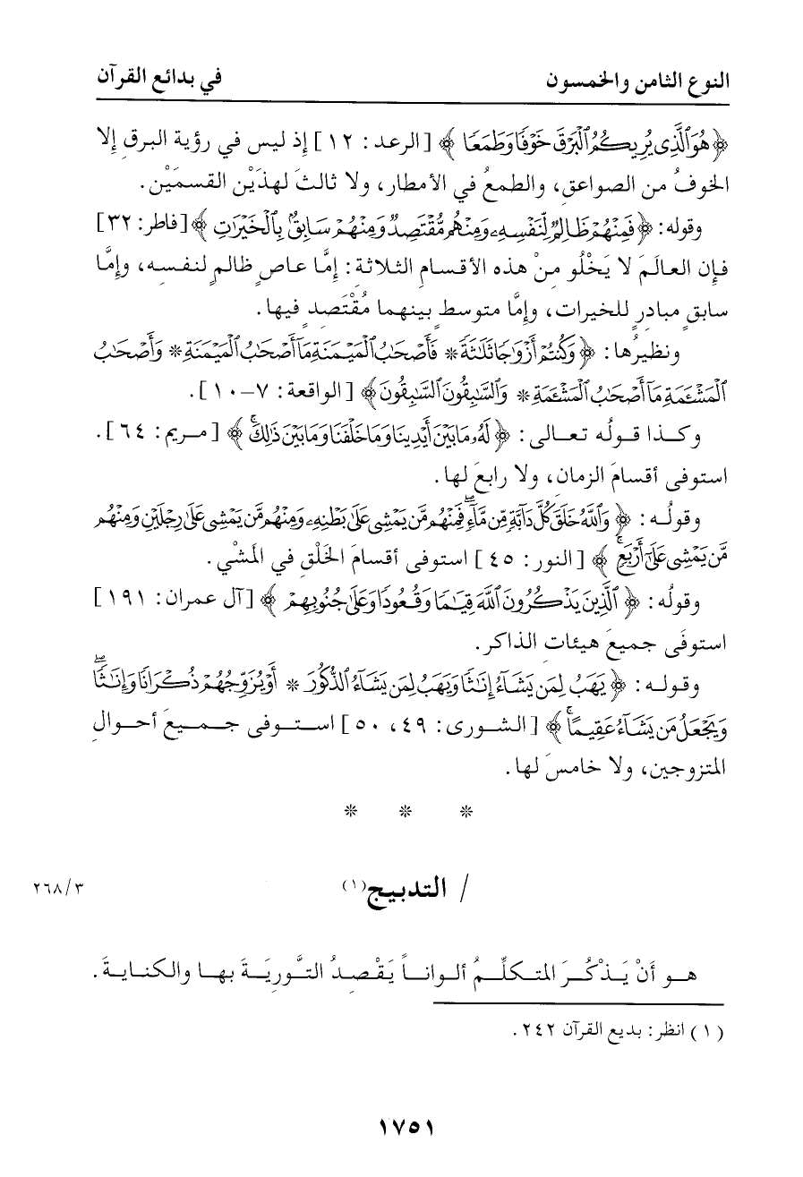 وقوله { يهب لمن يشاء إناثا ويهب لمن يشاء الذكور أو يزوجهم ذكرانا وإناثا ويجعل من يشاء عقيما } استوفى جميع أحوال المتزوجين ولا خامس لها 16 - التدبيج