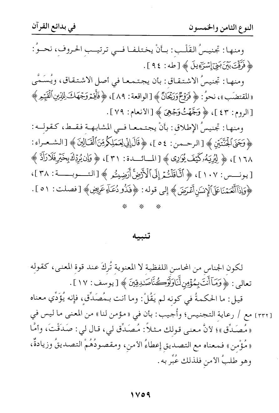 5064 ومنها تجنيس الإشتقاق بأن يجتمعا في أصل الإشتقاق ويسمى المقتضب نحو { فروح وريحان } { فأقم وجهك للدين القيم } { وجهت وجهي }