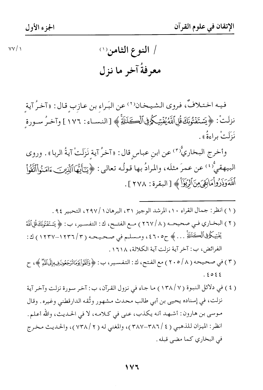 307 فروى الشيخان عن البراء بن عازب قال آخر آية نزلت { يستفتونك قل الله يفتيكم في الكلالة } وآخر سورة نزلت براءة