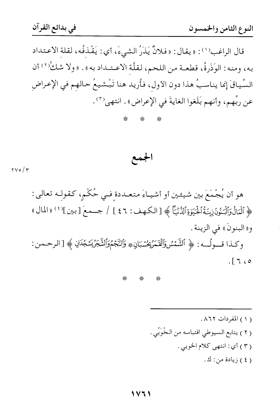 5069 هو أن يجمع بين شيئين أو أشياء متعددة في حكم كقوله تعالى { المال والبنون زينة الحياة الدنيا } جمع المال والبنون في الزينة