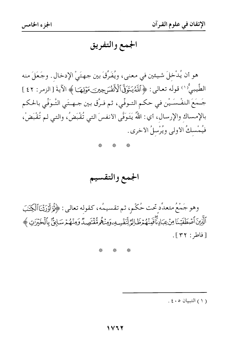 5070 هو أن تدخل شيئين في معنى وتفرق بين جهتي الإدخال وجعل منه الطيبي قوله { الله يتوفى الأنفس حين موتها } الآية جمع النفسين في حكم المتوفي ثم فرق بين جهتي التوفي بالحكم بالإمساك والإرسال أي الله يتوفى الأنفس التي تقبض والتي لم تقبض فيمسك الأولى ويرسل الأخرى 26 - الجمع والتقسيم