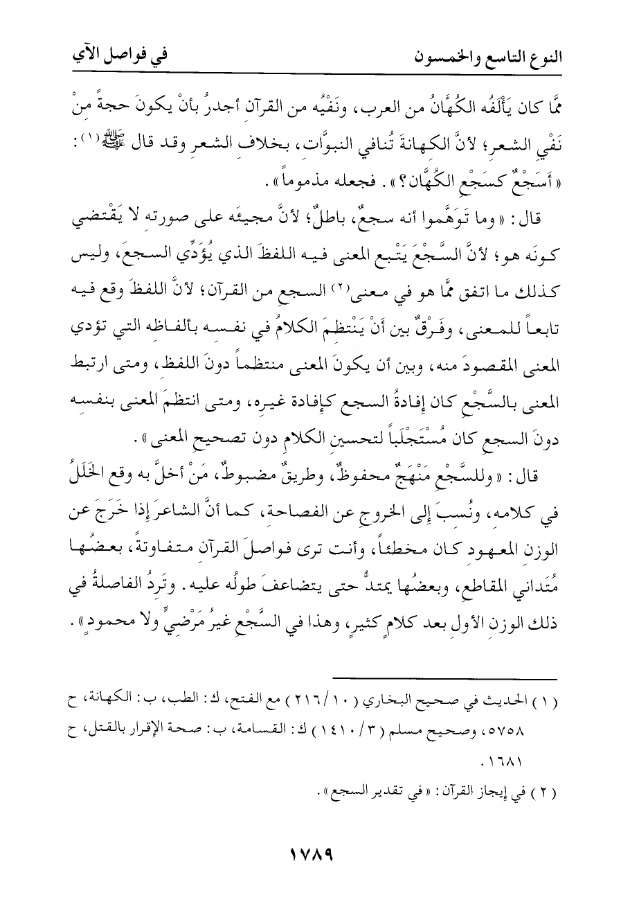 قال وما توهموا أنه سجع باطل لأن مجيئه على صورته لا يقتضي كونه هو لأن السجع يتبع المعنى فيه اللفظ الذي يؤدي السجع وليس كذلك ما اتفق مما هو في معنى السجع من القرآن لأن اللفظ وقع فيه تابعا للمعنى وفرق بين أن ينتظم الكلام في نفسه بألفاظه التي تؤدي المعنى المقصود منه وبين أن يكون المعنى منتظما دون اللفظ ومتى ارتبط المعنى بالسجع كان إفادة السجع كإفادة غيره ومتى انتظم المعنى بنفسه دون السجع كان مستجلبا لتحسين الكلام دون تصحيح المعنى