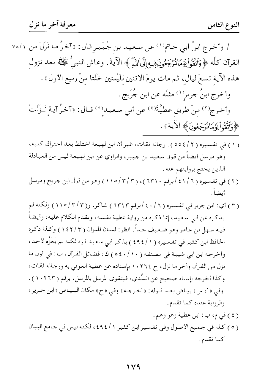 315 وأخرج ابن أبي حاتم عن سعيد بن جبير قال آخر ما نزل من القرآن كله { واتقوا يوما ترجعون فيه إلى الله } الآية وعاش النبي صلى الله عليه وسلم بعد نزول هذه الآية تسع ليال ثم مات ليلة الاثنين لليلتين خلتا من ربيع الأول