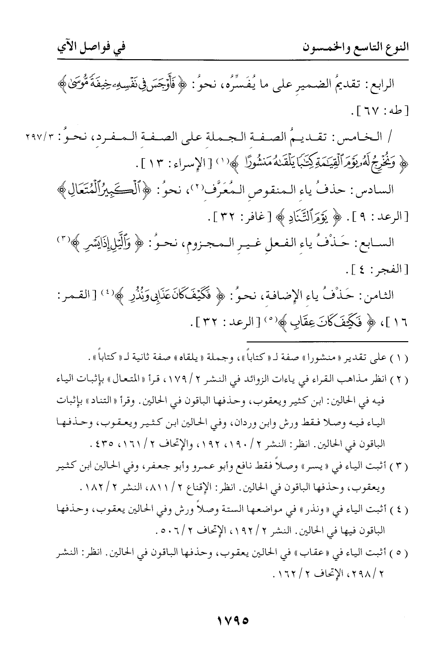 5132 الثامن حذف ياء الإضافة نحو { فكيف كان عذابي ونذر } { فكيف كان عقاب