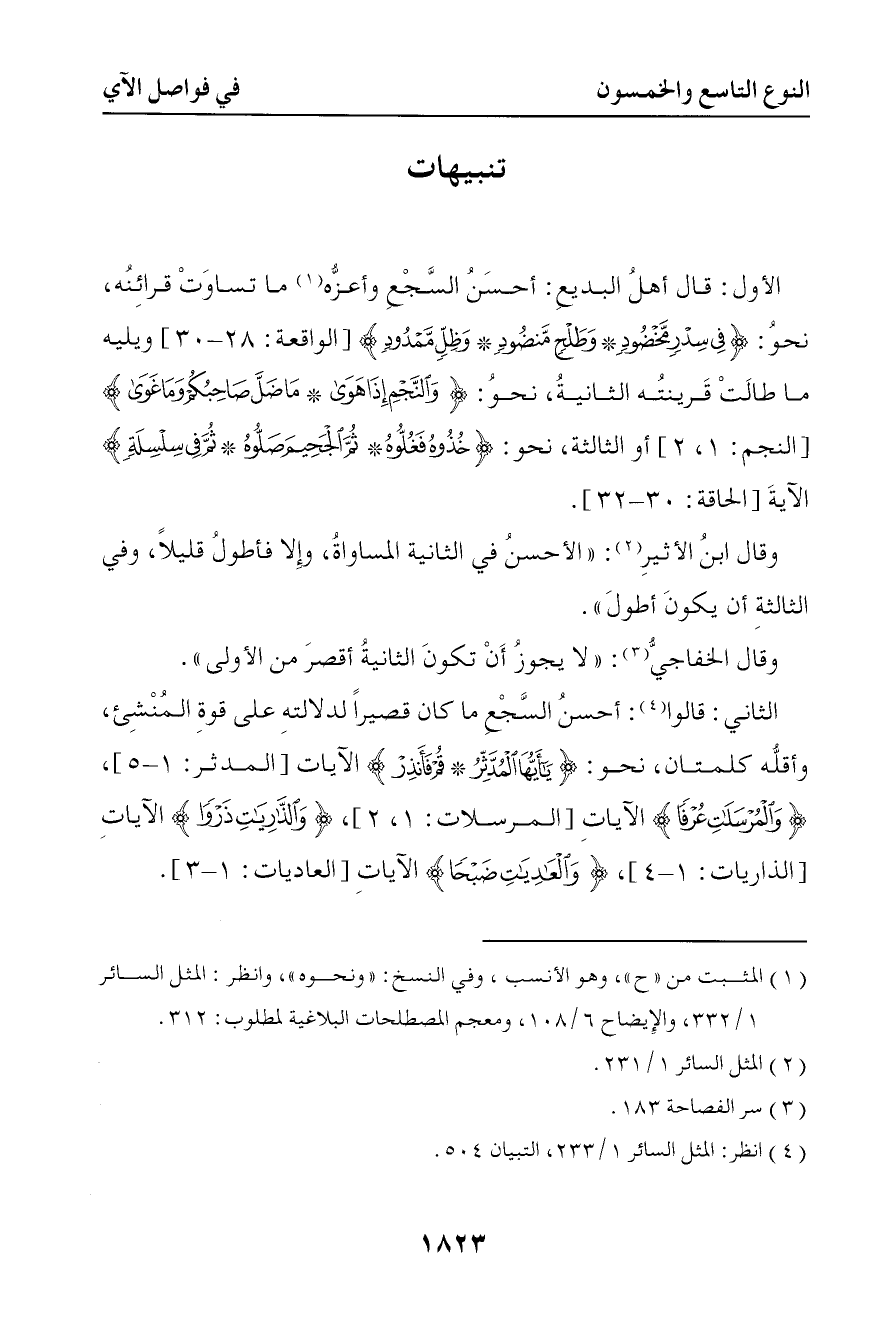5197 قال أهل البديع أحسن السجع ونحوه ما تساوت قرائنه نحو { في سدر مخضود وطلح منضود وظل ممدود } ويليه ما طالت قرينته الثانية نحو { والنجم إذا هوى ما ضل صاحبكم وما غوى }