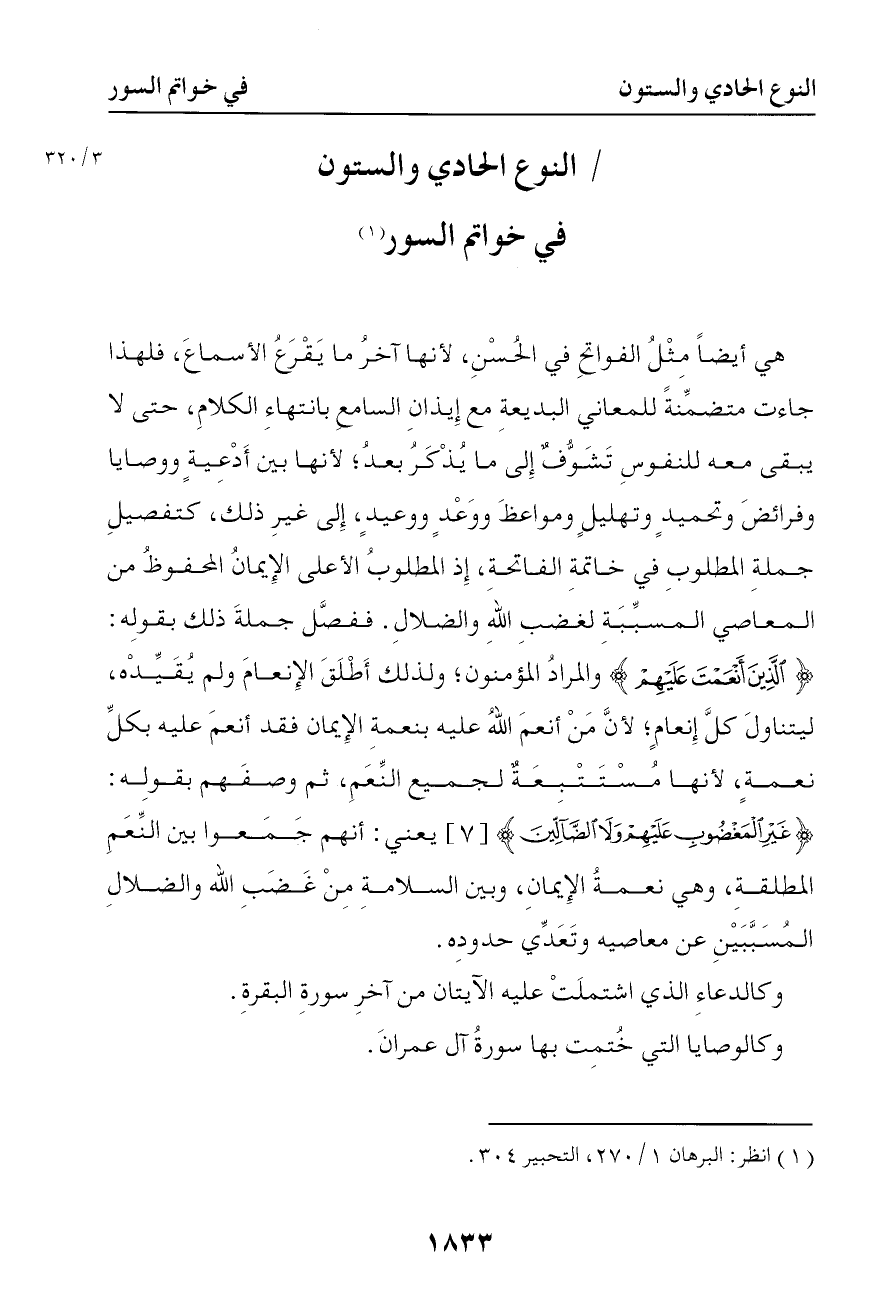 5219 هى أيضا مثل الفواتح فى الحسن لأنها آخر ما يقرع الأسماع فلهذا جاءت متضمنة للمعاني البديعة مع إيذان السامع بانتهاء الكلام حتى يبقى معه للنفوس تشوق إلى ما يذكر بعد لأنها بين أدعية ووصايا وفرائض وتحميد وتهليل ومواعظ ووعد ووعيد إلى غير ذلك كتفصيل جملة المطلوب في خاتمة الفاتحة إذ المطلوب الأعلى الإيمان المحفوظ من المعاصي المسببة لغضب الله والضلال ففصل جملة ذلك بقوله { الذين أنعمت عليهم } والمراد المؤمنون ولذلك أطلق الإنعام ولم يقيده ليتناول كل إنعام لأن من أنعم الله عليه بنعمة الإيمان فقد أنعم عليه بكل نعمة لأنها مستتبعة لجميع النعم ثم وصفهم بقوله { غير المغضوب عليهم ولا الضالين } يعني أنهم جمعوا بين النعم المطلقة وهي نعمة الإيمان وبين السلامة من غضب الله تعالى والضلال المسببين عن معاصيه وتعدي حدوده