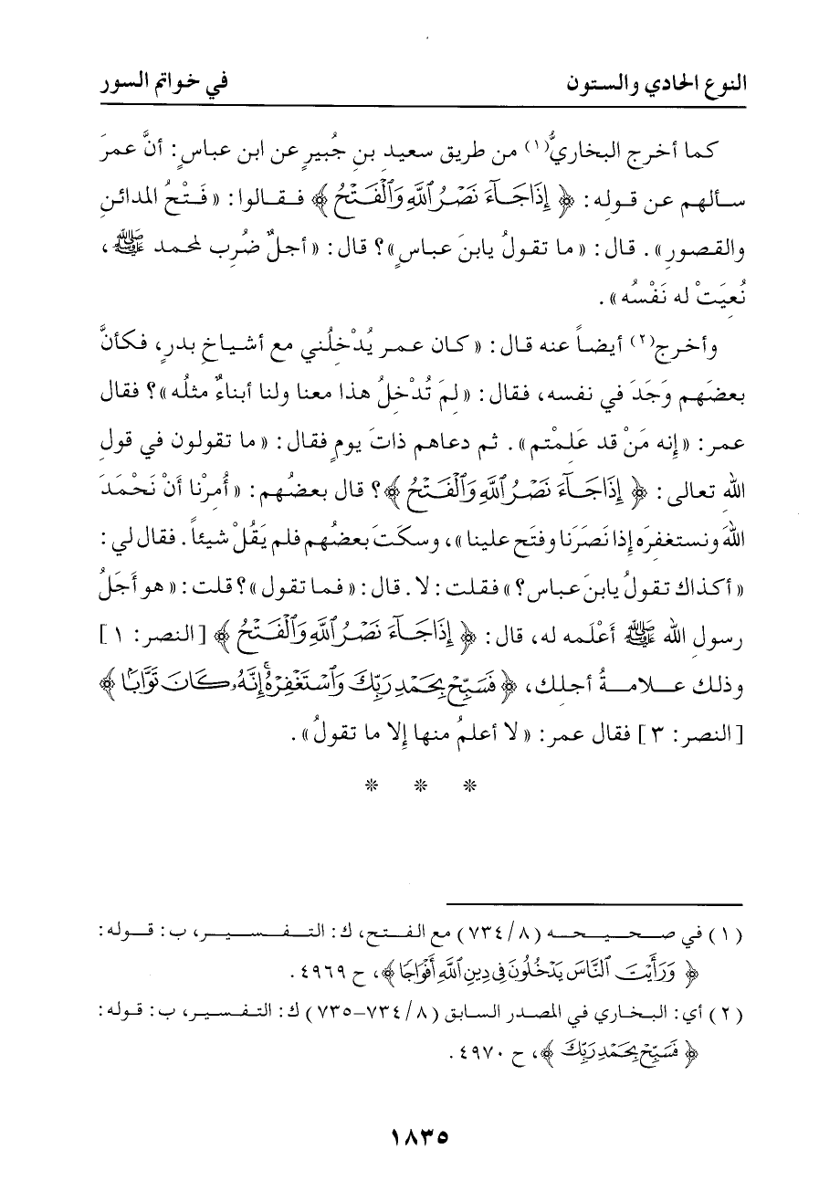 وأخرج أيضا عنه قال كان عمر يدخلني مع أشياخ بدر فكأن بعضهم وجد في نفسه فقال لم تدخل هذا معنا ولنا أبناء مثله فقال عمر إنه من قد علمتم ثم دعاهم ذات يوم فقال ما تقولون في قول الله { إذا جاء نصر الله والفتح } فقال بعضهم أمرنا أن نحمد الله ونستغفره إذا نصرنا وفتح علينا وسكت بعضهم فلم يقل شيئا فقال لي أكذلك تقول يا بن عباس فقلت لا قال فما تقول قلت هو أجل رسول الله صلى الله عليه وسلم أعلمه به قال { إذا جاء نصر الله والفتح } وذلك علامة أجلك { فسبح بحمد ربك واستغفره إنه كان توابا } فقال عمر إني لا أعلم منها إلا ما تقول