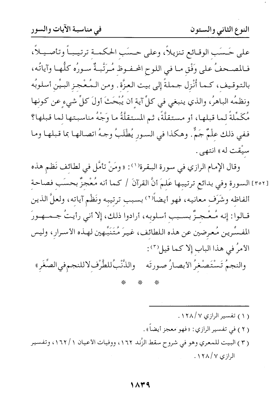 5226 وقال الإمام الرازي في سورة البقرة ومن تأمل في لطائف نظم هذه السورة وفي بدائع ترتيبها علم أن القرآن كما أنه معجز بحسب فصاحة ألفاظه وشرف معانيه فهو أيضا بسبب ترتيبه ونظم آياته ولعل الذين قالوا إنه معجز بسبب أسلوبه أرادوا ذلك إلا أني رأيت جمهور المفسرين معرضين عن هذه اللطائف غير منتبهين لهذه الأسرار وليس الأمر في هذا الباب إلا كما قيل