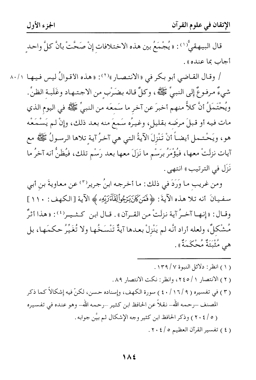 332 ومن غريب ما ورد في ذلك ما أخرجه ابن جرير عن معاوية بن أبي سفيان أنه تلا هذه الآية { فمن كان يرجو لقاء ربه } الآية وقال إنها آخر آية نزلت من القرآن قال ابن كثير هذا أثر مشكل ولعله أراد أنه لم ينزل بعدها آية تنسخها ولا تغير حكمها بل هي مثبتة محكمة