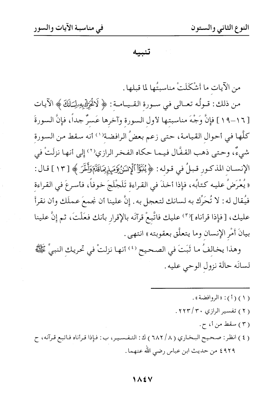 سورة القيامة { لا تحرك به لسانك لتعجل به } الآيات فإن وجه مناسبتها لأول السورة وآخرها عسر جدا فإن السورة كلها في أحوال القيامة حتى زعم بعض الرافضة أنه سقط من السورة شيء وحتى ذهب القفال فيما حكاه الفخر الرازي أنها نزلت في الإنسان المذكور قبل في قوله { ينبأ الإنسان يومئذ بما قدم وأخر } قال يعرض عليه كتابه فإذا أخذ في القراءة تلجلج خوفا فأسرع في القراءة فيقال له { لا تحرك به لسانك لتعجل به } إن علينا أن نجمع عملك وأن نقرأ عليك { فإذا قرأناه } عليك { فاتبع قرآنه } بالإقرار بأنك فعلت ثم إن علينا بيان أمر الإنسان وما يتعلق بعقوبته