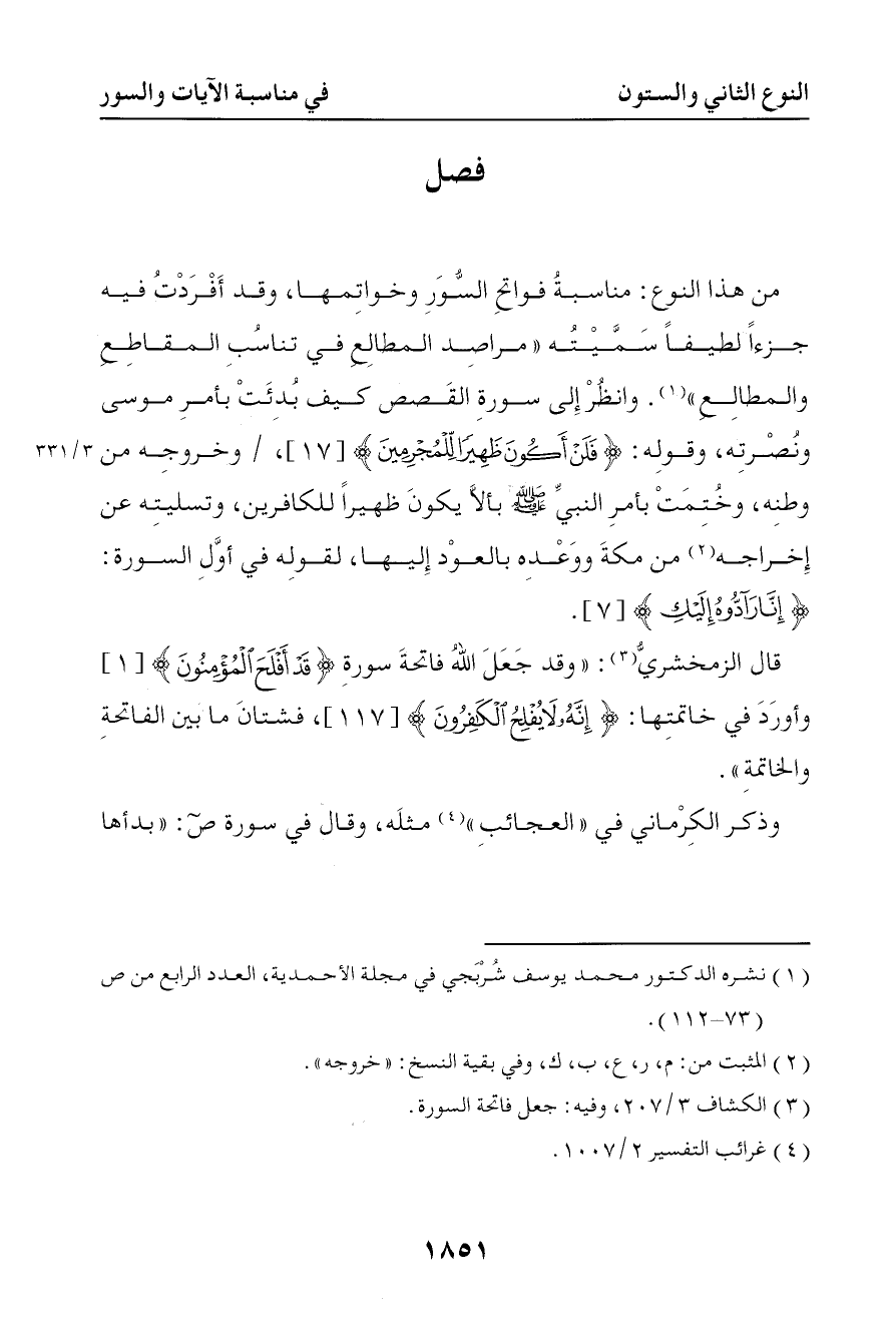 5249 من هذا النوع مناسبة فواتح السور وخواتمها وقد أفردت فيه جزءا لطيفا سميته ( مراصد المطالع في تناسب المقاطع والمطالع )