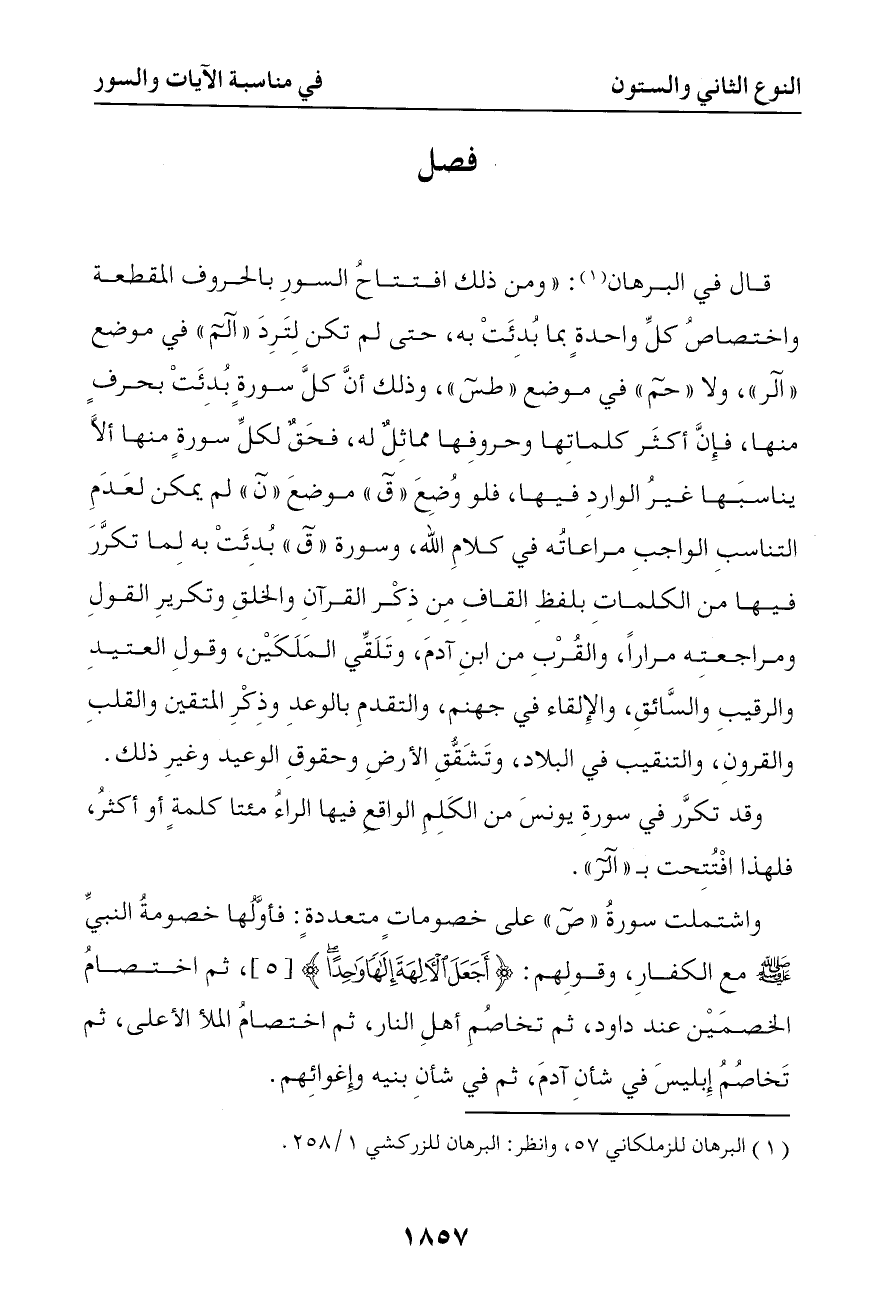 5260 قال في البرهان ومن ذلك افتتاح السور بالحروف المقطعة واختصاص كل واحدة بما بدئت به حتى لم يكن لترد ( الم ) في موضع ( الر ) ولا ( حم ) في موضع ( طس )
