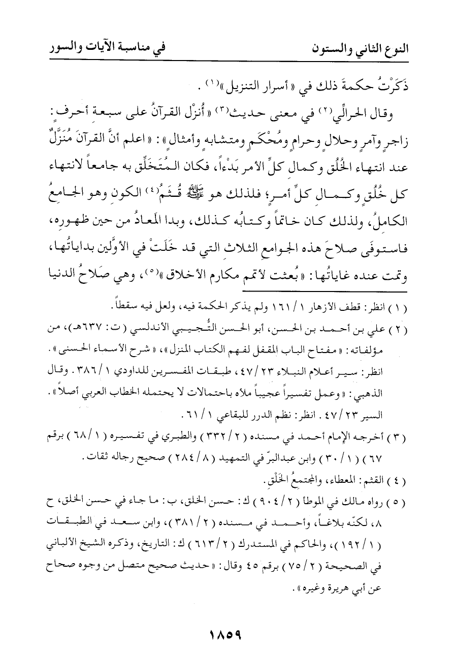 5262 وقال الحزاني في معنى حديث ( أنزل القرآن على سبعة أحرف زاجر وآمر وحلال وحرام ومحكم ومتشابه وأمثال ) اعلم أن القرآن منزل عند انتهاء الخلق وكمال كل الأمر بدأ فكان المتحلي به جامعا لانتهاء كل خلق وكمال كل أمر فلذلك هو صلى الله عليه وسلم قسيم الكون وهو الجامع الكامل ولذلك كان خاتما وكتابه كذلك وبدأ المعاد من حين ظهوره فاستوفى صلاح هذه الجوامع الثلاث التي قد خلت في الأولين بداياتها وتمت عنده غاياتها ( بعثت لأتمم مكارم الأخلاق ) وهي صلاح الدنيا