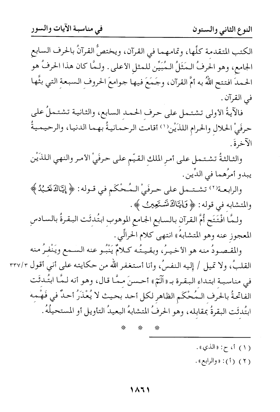 ولما كان هذا الحرف هو الحمد افتتح الله به أم القرآن وجمع فيها جوامع الحروف السبعة التي بثها في القرآن فالأولى تشتمل على حرف الحمد السابع والثانية تشتمل على حرفي الحلال والحرام اللذين أقامت الرحمانية بهما الدنيا والرحيمية الآخرة والثالثة تشتمل على أمر الملك القيم على حرفي الأمر والنهي الذين يبدأ أمرهما في الدين والرابعة تشتمل على حرفي المحكم في قوله { إياك نعبد } والمتشابه في قوله { وإياك نستعين } ولما افتتح أم القرآن بالسابع الجامع الموهوب ابتدئت البقرة بالسادس المعجوز عنه وهو المتشابه