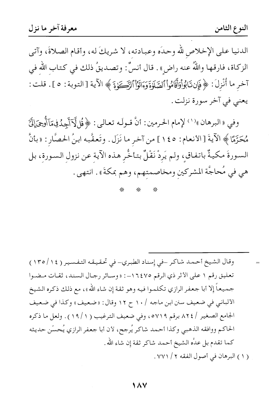 338 وفي البرهان لإمام الحرمين إن قوله تعالى { قل لا أجد فيما أوحي إلي محرما } الآية من آخر ما نزل