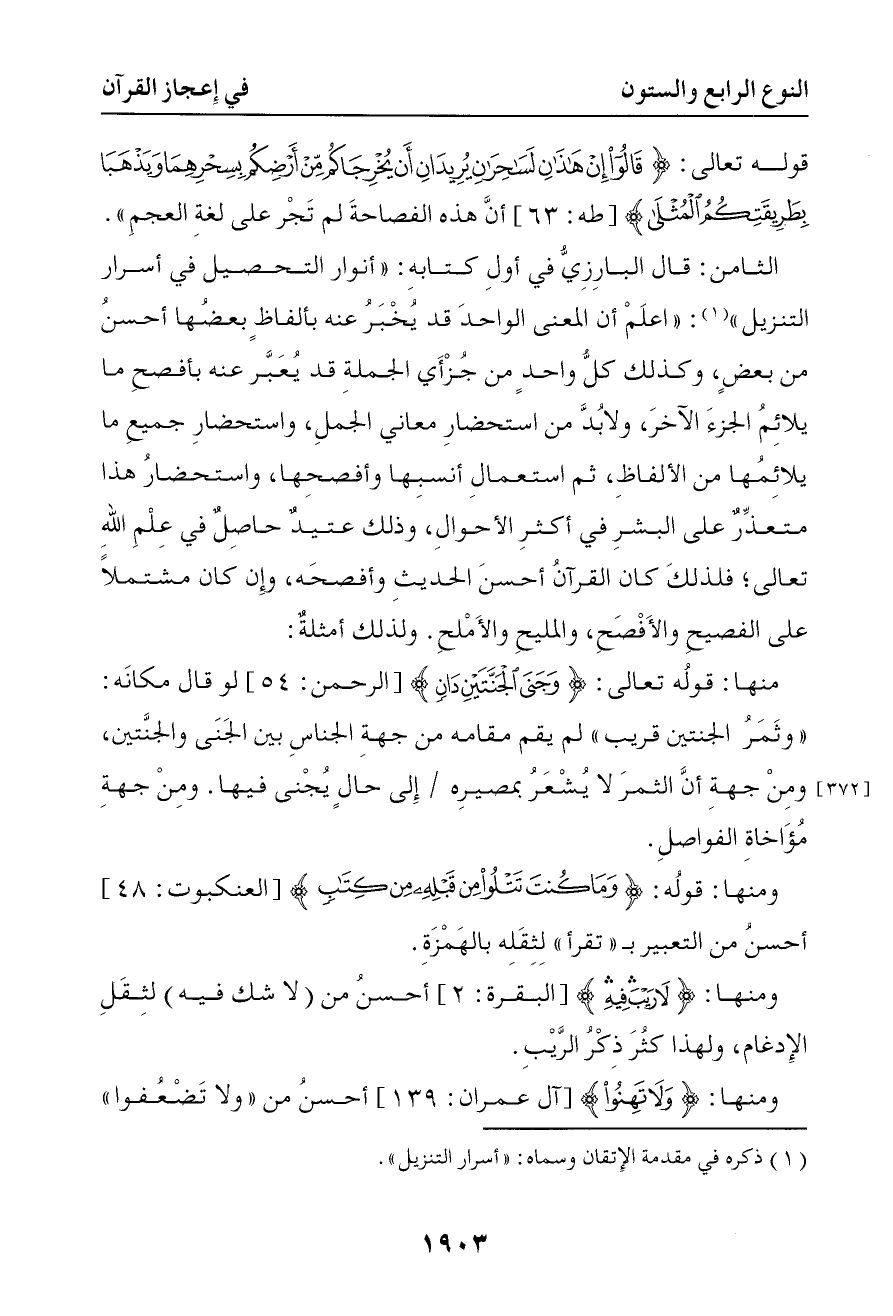 5319 قال البارزي في أول كتابه ( أنوار التحصيل في أسرار التنزيل ) اعلم أن المعنى الواحد قد يخبر عنه بألفاظ بعضها أحسن من بعض وكذلك كل واحد من جزأي الجملة قد يعبر عنه بأفصح ما يلائم الجزء الآخر ولا بد من إستحضار معاني الجمل أو إستحضار جميع ما يلائمها من الألفاظ ثم إستعمال أنسبها وأفصحها وإستحضار هذا متعذر على البشر في أكثر الأحوال وذلك عتيد حاصل في علم الله تعالى فلذلك كان القرآن أحسن الحديث وأفصحه وإن كان مشتملا على الفصيح والأفصح والمليح والأملح ولذلك أمثلة منها قوله تعالى { وجنى الجنتين دان } لو قال مكانه ( وثمر الجنتين قريب ) لم يقم مقامه من جهة الجناس بين الجنى والجنتين ومن جهة أن الثمر لا يشعر بمصيره إلى حال يجني فيها ومن جهة مؤاخاة الفواصل