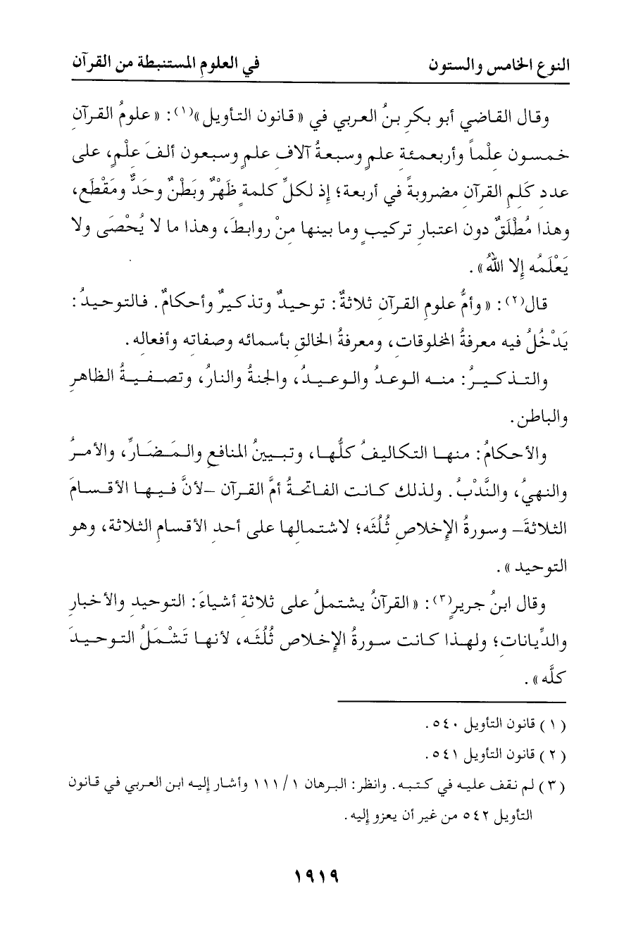 5384 وقال القاضي أبو بكر بن العربي في قانون التأويل علوم القرآن خمسون علما وأربعمائة علم وسبعة آلاف علم وسبعون ألف علم على عدد كلم القرآن مضروبة في أربعة إذ لكل كلمة ظهر وبطن وحد ومطلع وهذا مطلق دون اعتبار تركيب وما بينها من روابط وهذا ما لا يحصى ولا يعلمه إلا الله