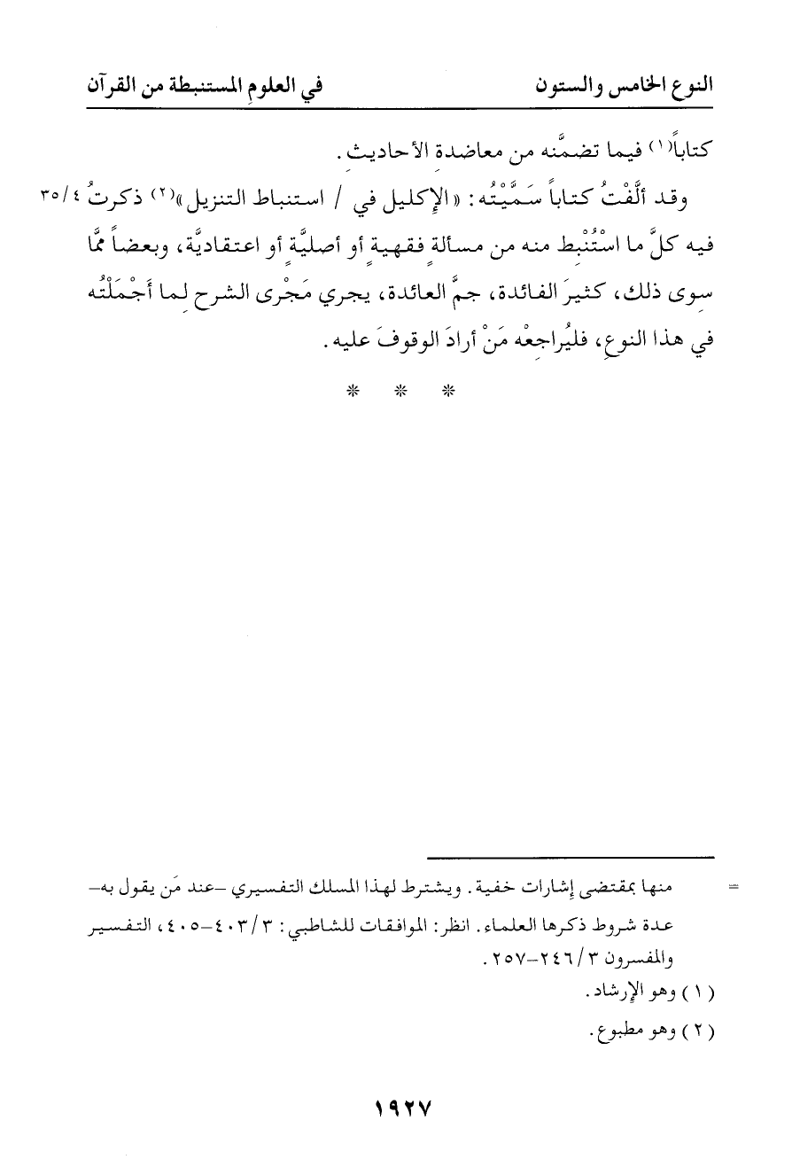 وقد ألفت كتابا سميته ( الإكليل في استنباط التنزيل ) ذكرت فيه كل ما استنبط منه من مسألة فقهية أو أصلية أو اعتقادية وبعضا مما سوى ذلك كثير الفائدة جم العائدة يجري مجرى الشرح لما أجملته في هذا النوع فليراجعه من أراد الوقوف عليه
