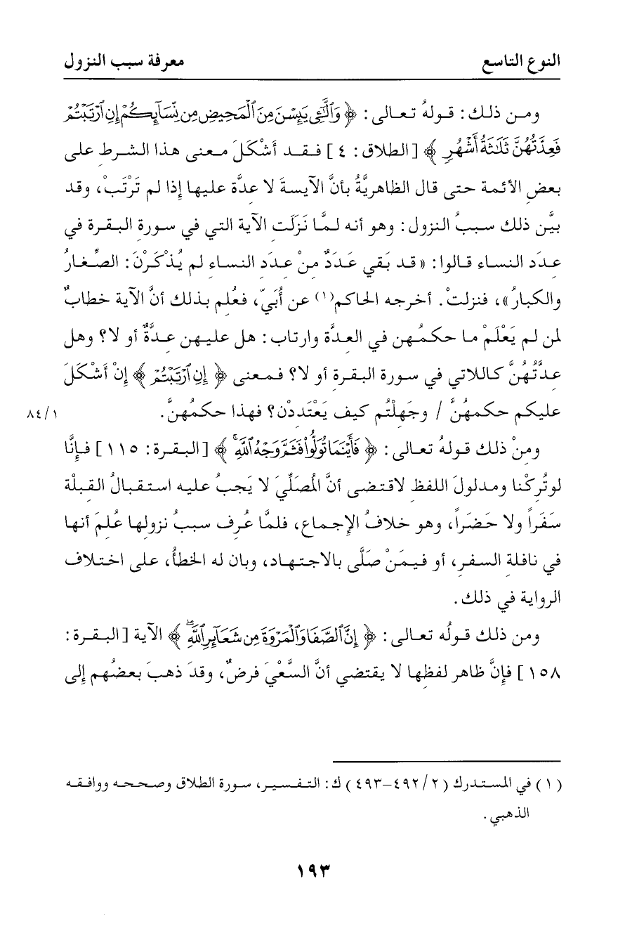348 ومن ذلك قوله تعالى { واللائي يئسن من المحيض من نسائكم إن ارتبتم فعدتهن ثلاثة أشهر } فقد أشكل معنى هذا الشرط على بعض الأئمة حتى قال الظاهرية بأن الآيسة لا عدة عليها إذا لم ترتب وقد بين ذلك سبب النزول وهو أنه لما نزلت الآية التي في سورة البقرة في عدد النساء قالوا قد بقي عدد من عدد النساء لم يذكرن الصغار والكبار فنزلت أخرجه الحاكم عن أبي فعلم بذلك أن الآية خطاب لمن لم يعلم ما حكمهن في العدة وارتاب هل عليهن عدة أو لا وهل عدتهن كاللاتي في سورة البقرة أو لا فمعنى إن ارتبتم إن أشكل عليكم حكمهن وجهلتم كيف يعتدون فهذا حكمهن