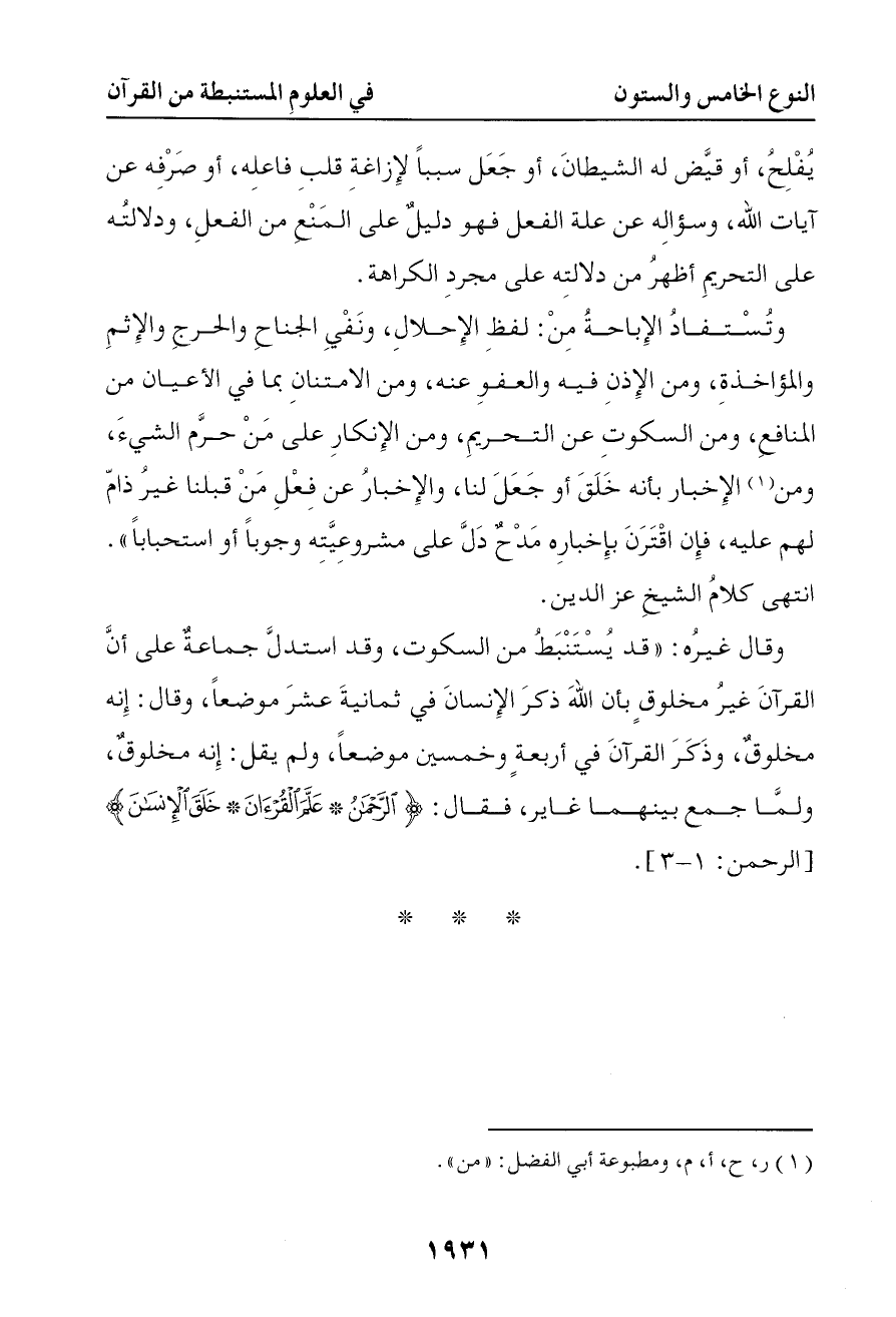 وقد استدل جماعة على أن القرآن غير مخلوق بأن الله ذكر الإنسان في ثمانية عشر موضعا وقال إنه مخلوق وذكر القرآن في أربعة وخمسين موضعا ولم يقل إنه مخلوق ولما جمع بينهما غاير فقال { الرحمن علم القرآن خلق الإنسان