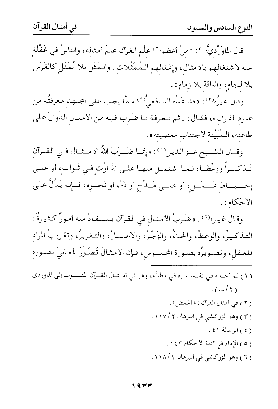 5402 وقال غيره قد عده الشافعي مما يجب على المجتهد معرفته من علوم القرآن فقال ثم معرفة ما ضرب فيه من الأمثال الدوال على طاعته المبينة لاجتناب معصيته