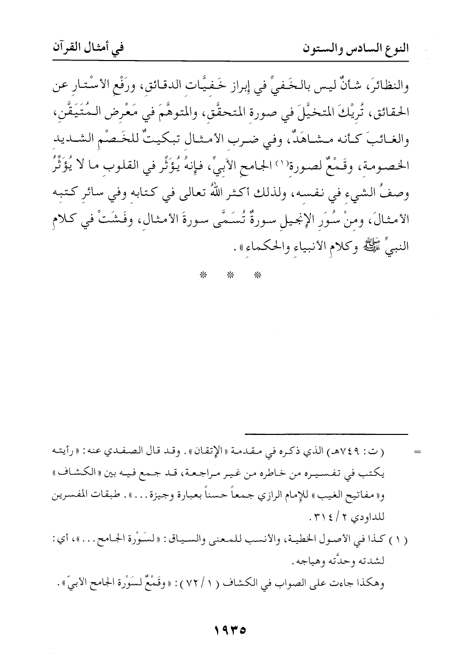 النظائر شأن ليس بالخفي في إبراز خفيات الدقائق ورفع الأستار عن الحقائق تريك المتخيل في صورة المتحقق والمتوهم في معرض المتيقن والغائب كأنه مشاهد وفي ضرب الأمثال تبكيت للخصم الشديد الخصومة وقمع لسورة الجامح الأبي فإنه يؤثر في القلوب ما لا يؤثر في وصف الشيء في نفسه ولذلك أكثر الله تعالى في كتابه وفي سائر كتبه الأمثال ومن سور الإنجيل سورة تسمى سورة الأمثال وفشت في كلام النبي صلى الله عليه وسلم وكلام الأنبياء والحكماء