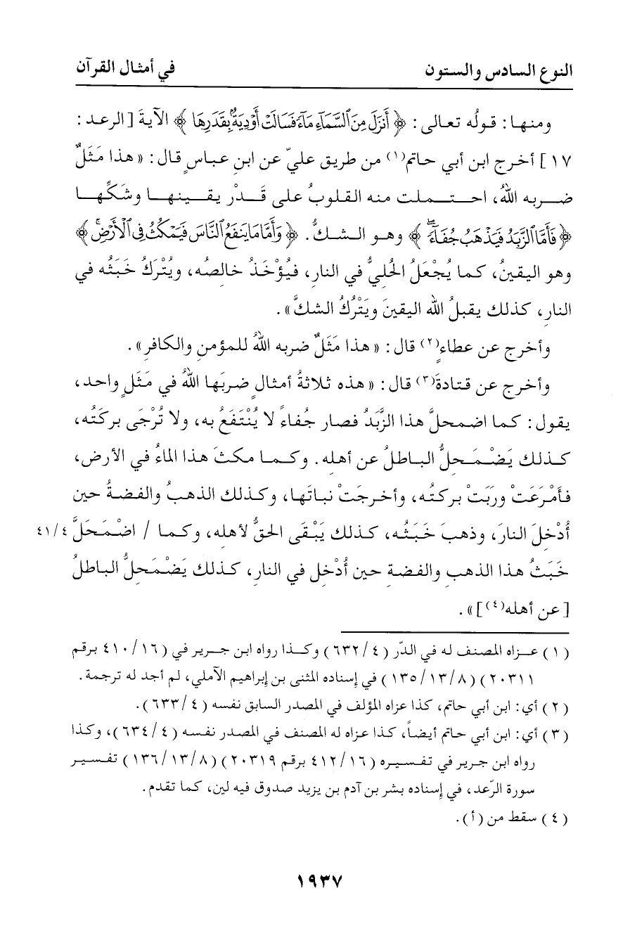 5410 ومنها قوله تعالى { أنزل من السماء ماء فسالت أودية بقدرها } ألاية أخرج ابن أبي حاتم من طريق علي عن ابن عباس قال هذا مثل ضربه الله احتملت منه القلوب على قدر يقينها وشكها { فأما الزبد فيذهب جفاء } وهو الشك { وأما ما ينفع الناس فيمكث في الأرض } وهو اليقين كما يجعل الحلي في النار فيؤخذ خالصه ويترك خبثه في النار كذلك يقبل الله اليقين ويترك الشك