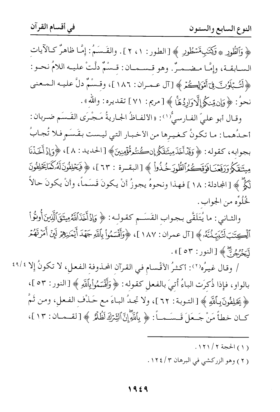 5425 والقسم إما ظاهر كالآيات السابقة وإما مضمر وهو قسمان قسم دلت عليه اللام نحو { لتبلون في أموالكم } وقسم دل عليه المعنى نحو { وإن منكم إلا واردها } تقديره ( والله )