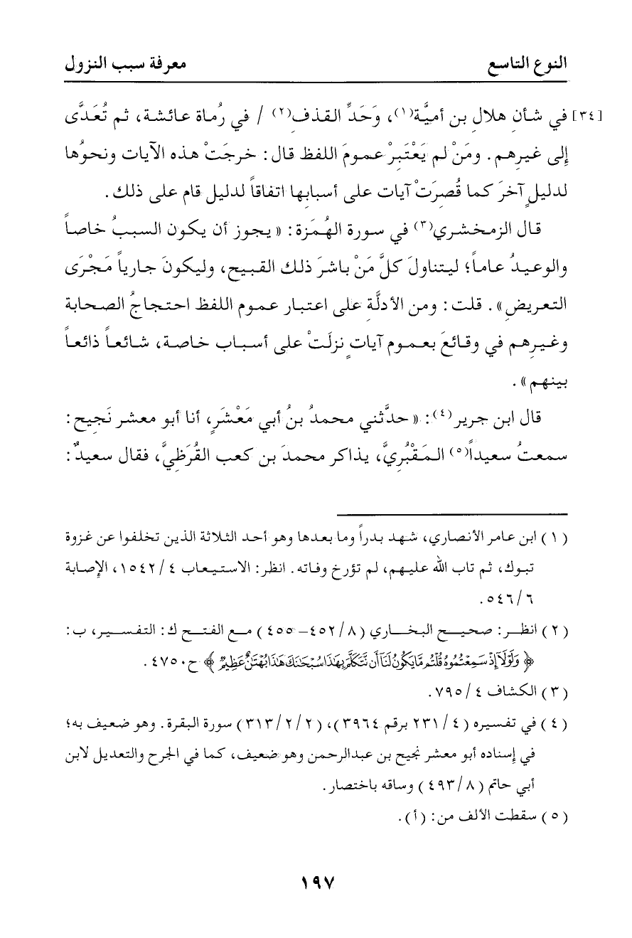354 قلت ومن الأدلة على اعتبار عموم اللفظ احتجاج الصحابة وغيرهم في وقائع بعموم آيات نزلت على أسباب خاصة شائعا ذائعا بينهم قال ابن جرير حدثني محمد بن أبي معشر أخبرنا أبي أبو معشر نجيح سمعت سعيد المقبري يذاكر محمد بن كعب القرظي فقال سعيد