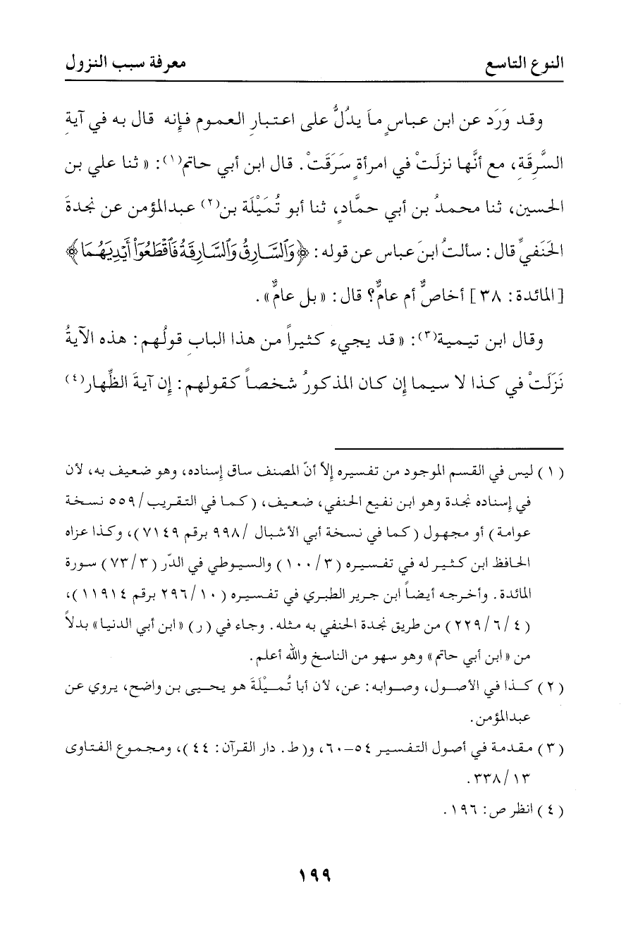 وقد ورد عن ابن عباس ما يدل على اعتبار العموم فإنه قال به في آية السرقة مع أنها نزلت في امرأة سرقت قال ابن أبي حاتم حدثنا علي بن الحسين حدثنا محمد بن أبي حماد حدثنا أبو تميلة بن عبد المؤمن عن نجدة الحنفي قال سألت ابن عباس عن قوله { والسارق والسارقة فاقطعوا أيديهما } أخاص أم عام قال بل عام