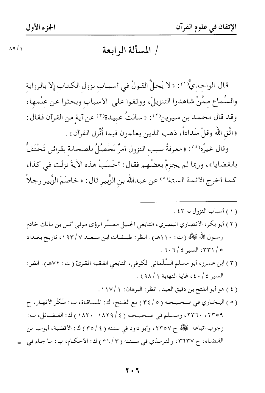 360 قال الواحدي لا يحل القول في أسباب نزول الكتاب إلا بالرواية والسماع ممن شاهدوا التنزيل ووقفوا على الأسباب وبحثوا عن علمها وقد قال محمد بن سيرين سألت عبيدة عن آية من القرآن فقال اتق الله وقل سدادا ذهب الذين يعلمون فيم أنزل الله القرآن
