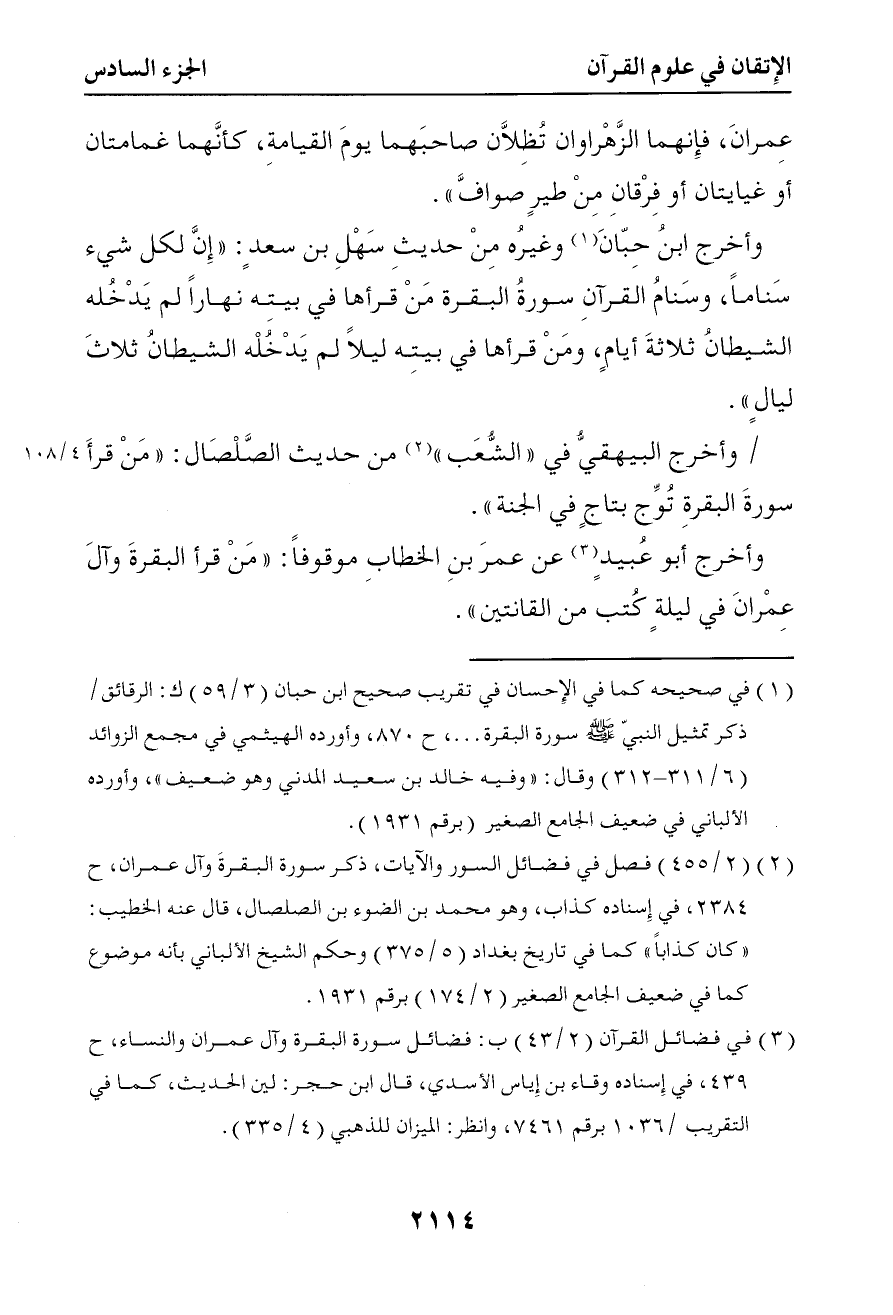 5897 وأخرج ابن حبان وغيره من حديث سهل بن سعد ( إن لكل شيء سناما وسنام القرآن سورة البقرة من قرأها في بيته نهارا لم يدخله الشيطان ثلاثة أيام