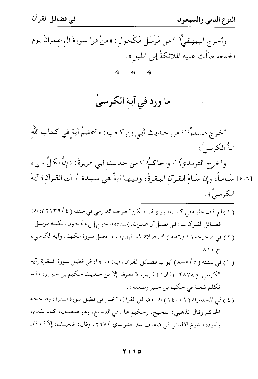 5900 وأخرج البيهقي من مرسل مكحول ( من قرأ سورة البقرة وسورة آل عمران يوم الجمعة صلت عليه الملائكة إلى الليل ) فصل ما ورد في آية الكرسي