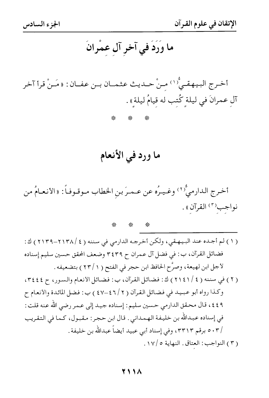 5908 أخرج البيهقي من حديث عثمان بن عفان ( من قرأ آخر آل عمران في ليلة كتب له قيام ليلة ) ما ورد في الأنعام