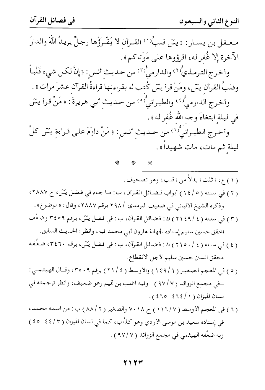 5920 وأخرج الترمذي والدارمي من حديث أنس ( إن لكل شيء قلبا وقلب القرآن يس ومن قرأ يس كتب الله له بقراءتها قراءة القرآن عشر مرات )