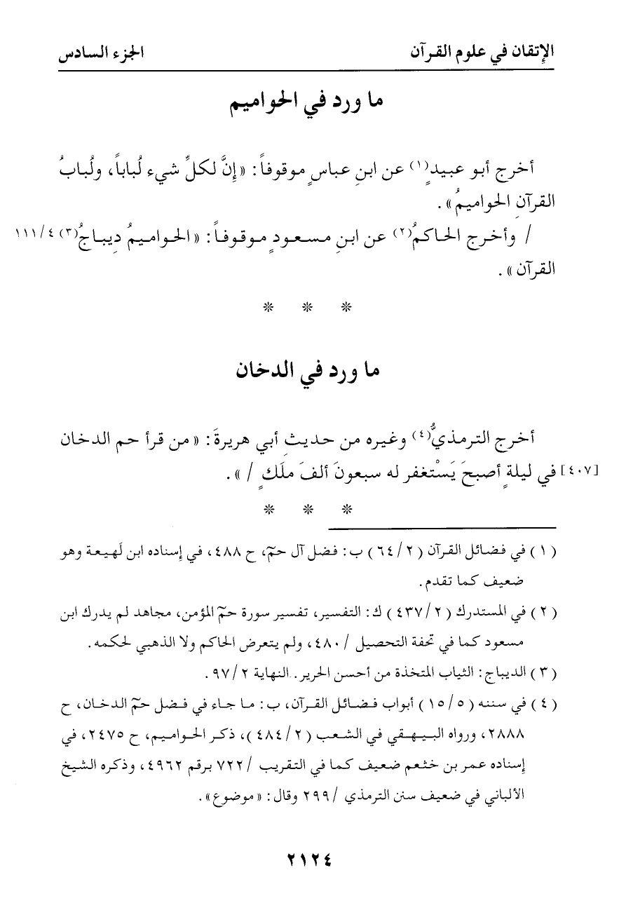 5924 وأخرج الحاكم عن ابن مسعود موقوفا ( الحواميم ديباج القرآن ) ما ورد في الدخان