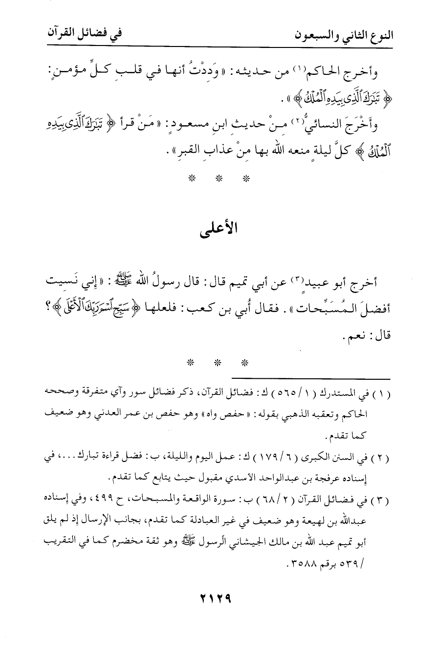 5935 وأخرج النسائي من حديث ابن مسعود ( من قرأ تبارك الذي بيده الملك كل ليلة منعه الله بها من عذاب القبر ) الأعلى