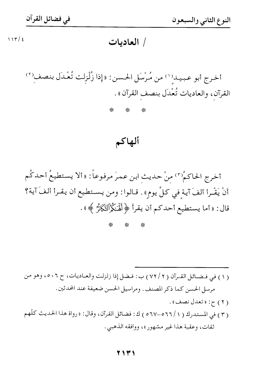 5939 أخرج أبو عبيد من مرسل الحسن ( إذا زلزلت تعدل بنصف القرآن والعاديات تعدل بنصف القرآن ) ألهاكم