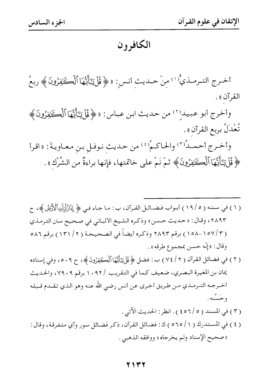 5941 أخرج الترمذي من حديث أنس ( قل يا أيها الكافرون ربع القرآن )