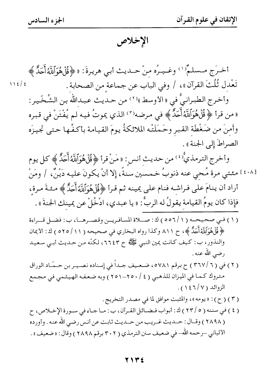 5946 أخرج مسلم وغيره من حديث أبي هريرة ( قل هو الله أحد تعدل ثلث القرآن ) وفي الباب عن جماعة من الصحابة وأخرج الطبراني في الأوسط من حديث عبد الله بن الشخير ( ومن قرأ قل هو الله أحد في مرضه الذي يموت فيه لم يفتن في قبره وأمن من ضغطة القبر وحملته الملائكة يوم القيامة بأكفها حتى تجيزه الصراط إلى الجنة )