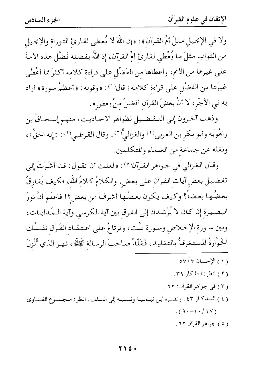 5964 وقال الغزالي في جواهر القرآن لعلك أن تقول قد أشرت إلى تفضيل بعض آيات القرآن على بعض والكلام كلام الله فكيف يفارق بعضها بعضا وكيف يكون بعضها أشرف من بعض فاعلم أن نور البصيرة إن كان لا يرشدك إلى الفرق بين آية الكرسي وآية المداينات وبين سورة الإخلاص وسورة تبت وترتاع على اعتقاد الفرق نفسك الخوارة المستغرقة بالتقليد فقلد صاحب الرسالة صلى الله عليه وسلم فهو الذي أنزل