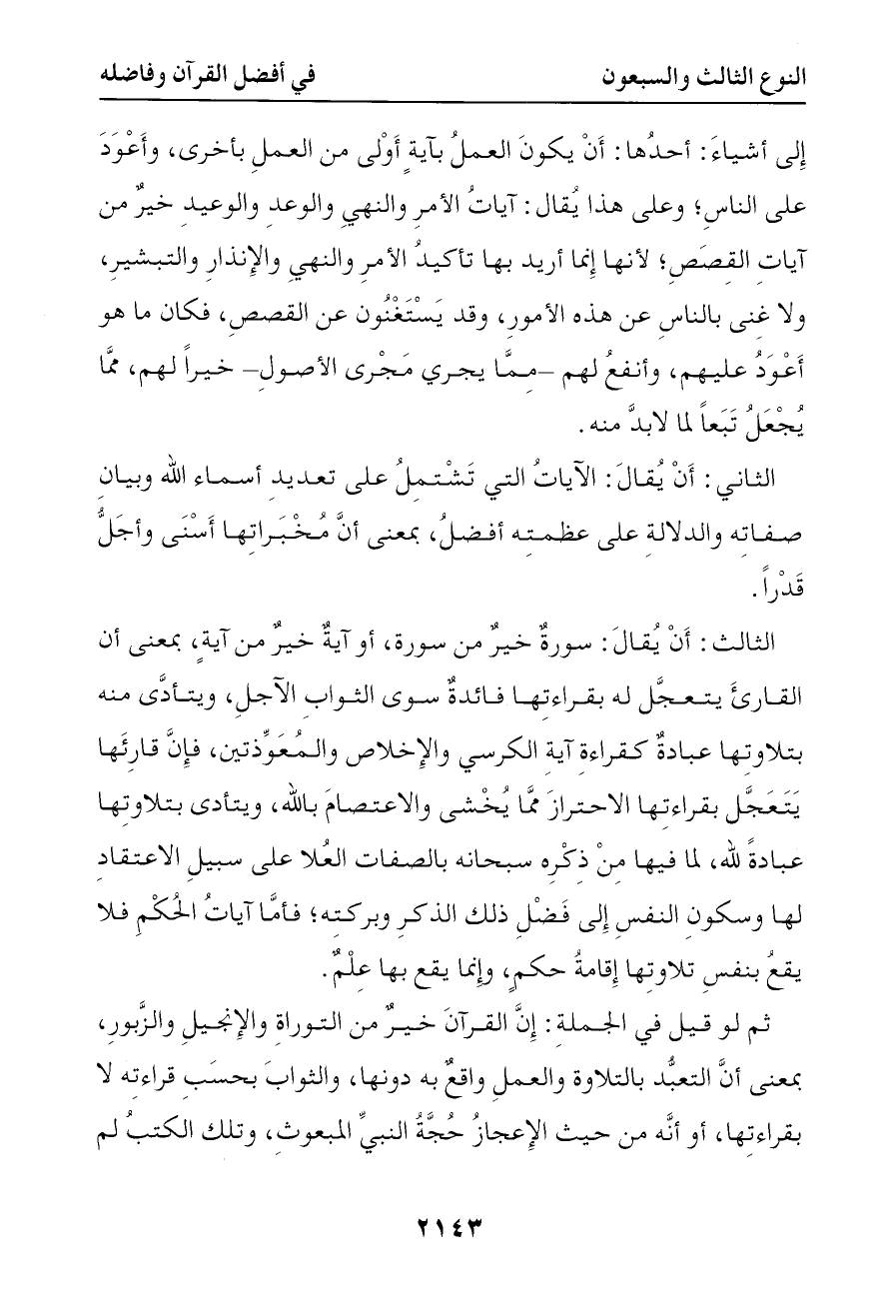 الثالث أن يقال سورة خير من سورة أو آية خير من آية بمعنى أن القارئ يتعجل له بقراءتها فائدة سوى الثواب الآجل ويتأدى منه بتلاوتها عبادة كقراءة آية الكرسي والإخلاص والمعوذتين فإن قارئها يتعجل بقراءتها الاحتراز مما يخشى والاعتصام بالله ويتأدى بتلاوتها عبادة الله لما فيها من ذكره سبحانه وتعالى بالصفات العلا على سبيل الاعتقاد لها وسكون النفس إلى فضل ذلك بالذكر وبركته فأما آيات الحكم فلا يقع بنفس تلاوتها إقامة حكم وإنما يقع بها علم