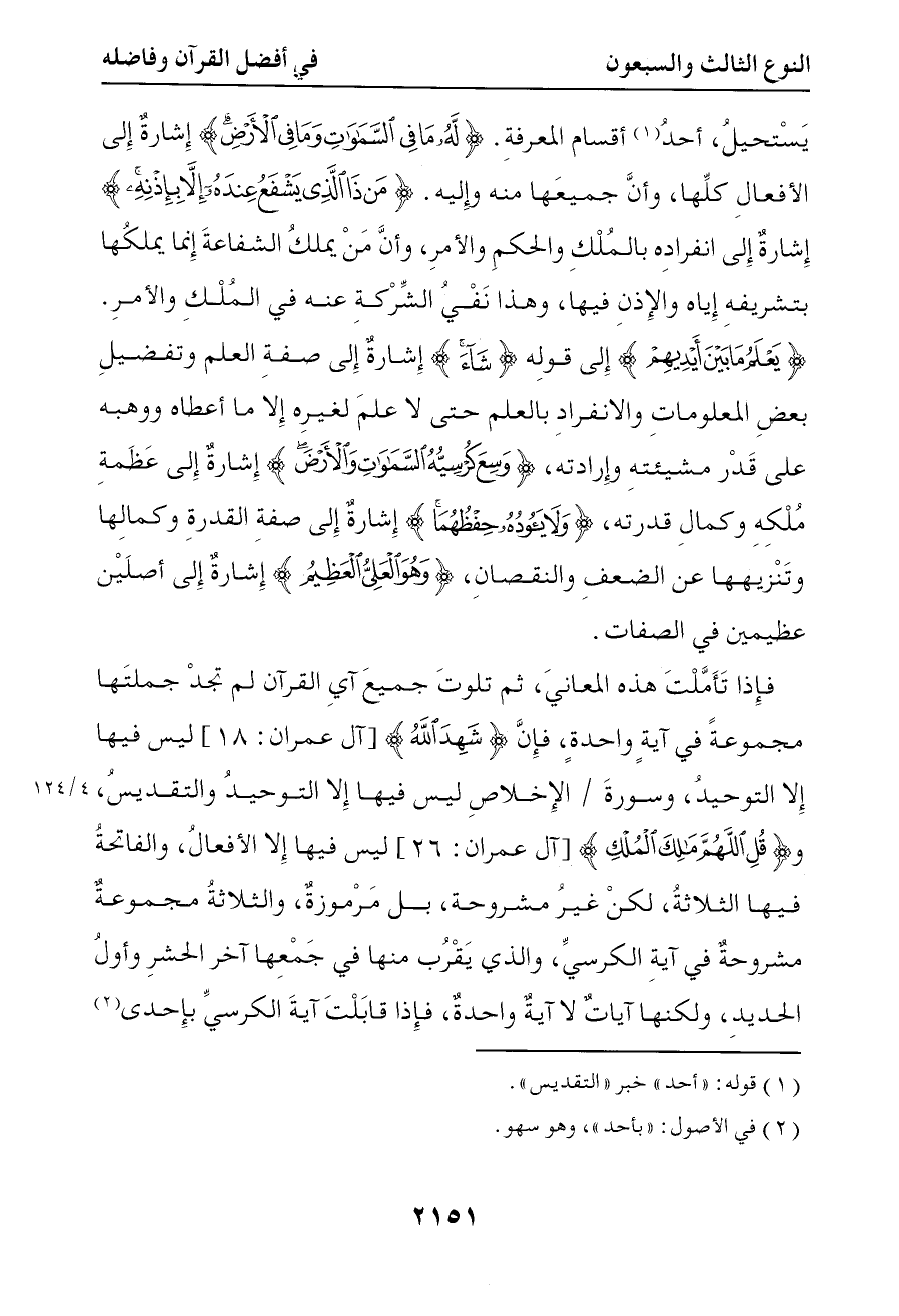 في آية واحدة فإن ( شهد الله ) فيها إلا التوحيد وسورة الإخلاص ليس فيها إلا التوحيد والتقديس و ( قل اللهم مالك الملك ) ليس فيها إلا الأفعال والفاتحة فيها الثلاثة لكن غير مشروحة بل مرموزة والثلاثة مجموعة مشروحة في آية الكرسي
