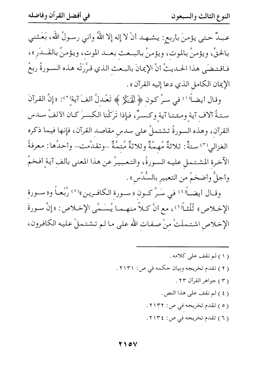 5994 وقال أيضا في سر كون سورة الكافرين ربعا وسورة الإخلاص ثلثا مع أن كلا منهما يسمى الإخلاص أن سورة الإخلاص اشتملت من صفات الله على ما لم تشتمل عليه ( الكافرون