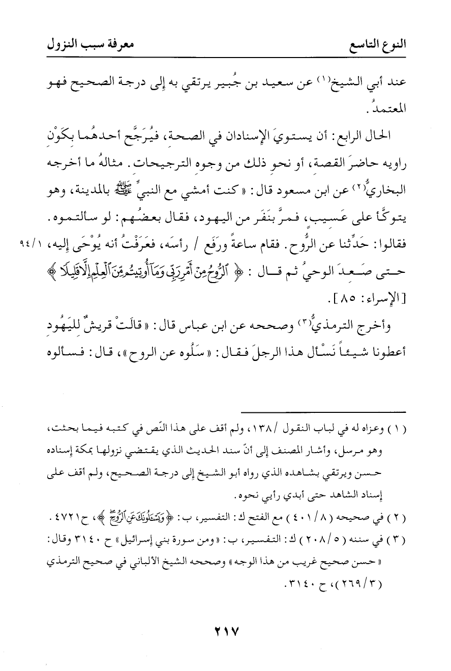 379 الحال الرابع أن يستوي الإسنادان في الصحة فيرجح أحدهما بكون راويه حاضر القصة أو نحو ذلك من وجوه الترجيحات مثاله ما أخرجه البخاري عن ابن مسعود قال كنت أمشي مع النبي صلى الله عليه وسلم بالمدينة وهو يتوكأ على عسيب فمر بنفر من اليهود فقال بعضهم لو سألتموه فقالوا حدثنا عن الروح فقام ساعة ورفع رأسه فعرفت أنه يوحى إليه حتى صعد الوحي ثم قال { قل الروح من أمر ربي وما أوتيتم من العلم إلا قليلا }